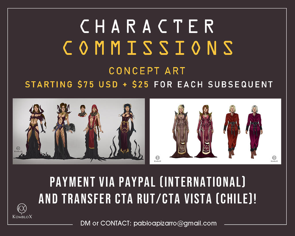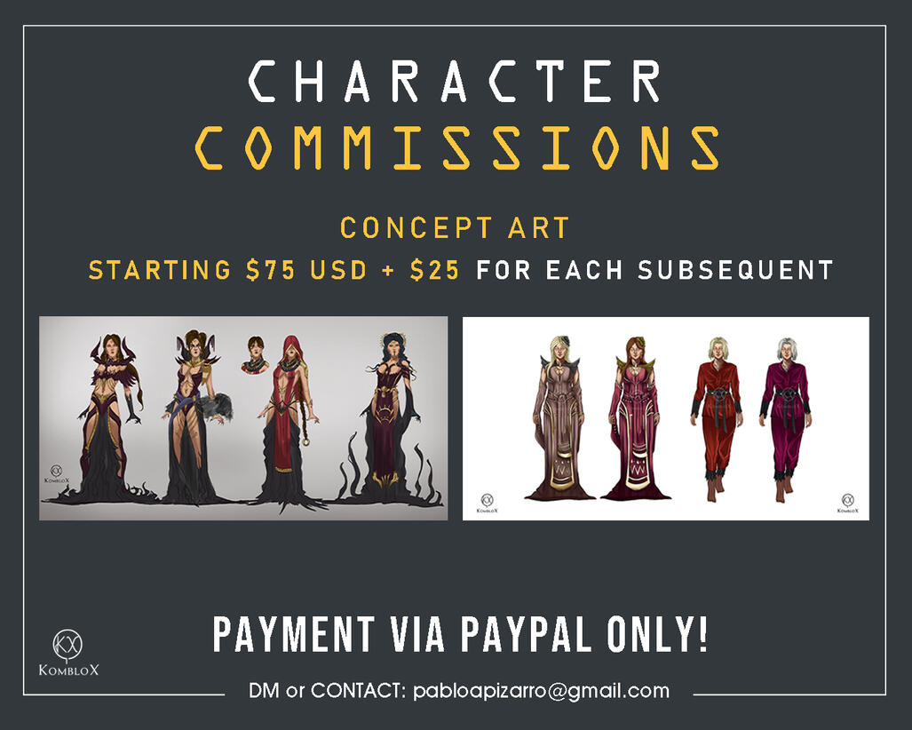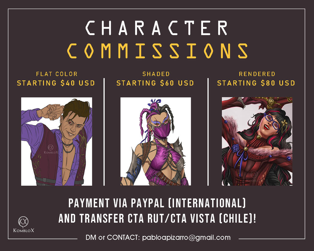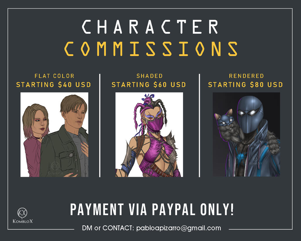Prices:• $80 - $90 USD Starting for Character Rendered. Increases depending on complexity.