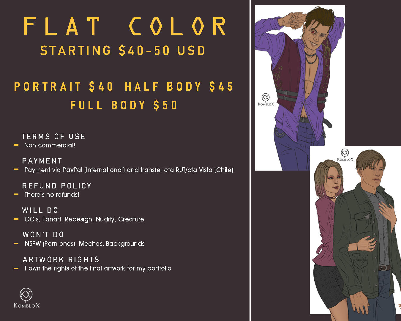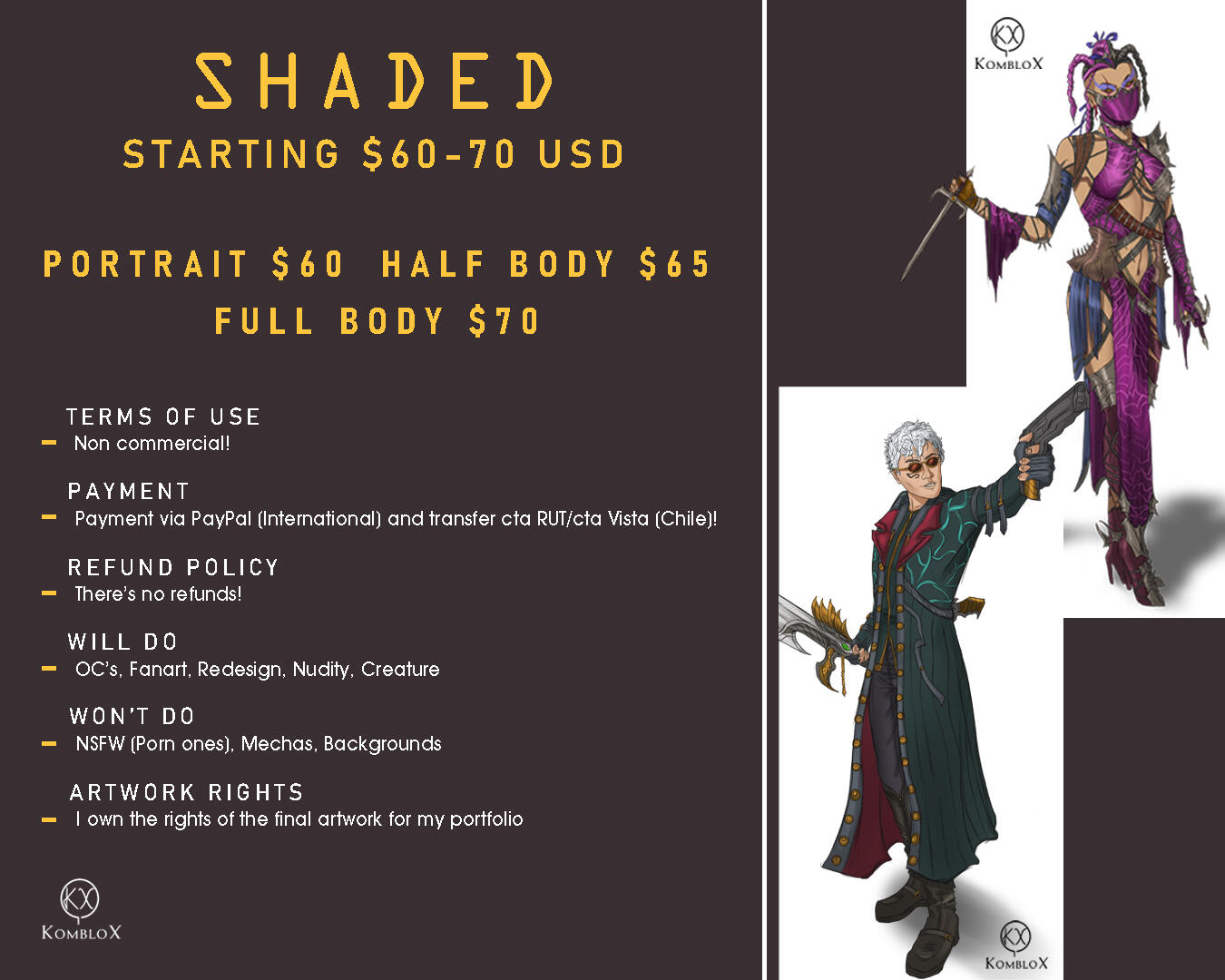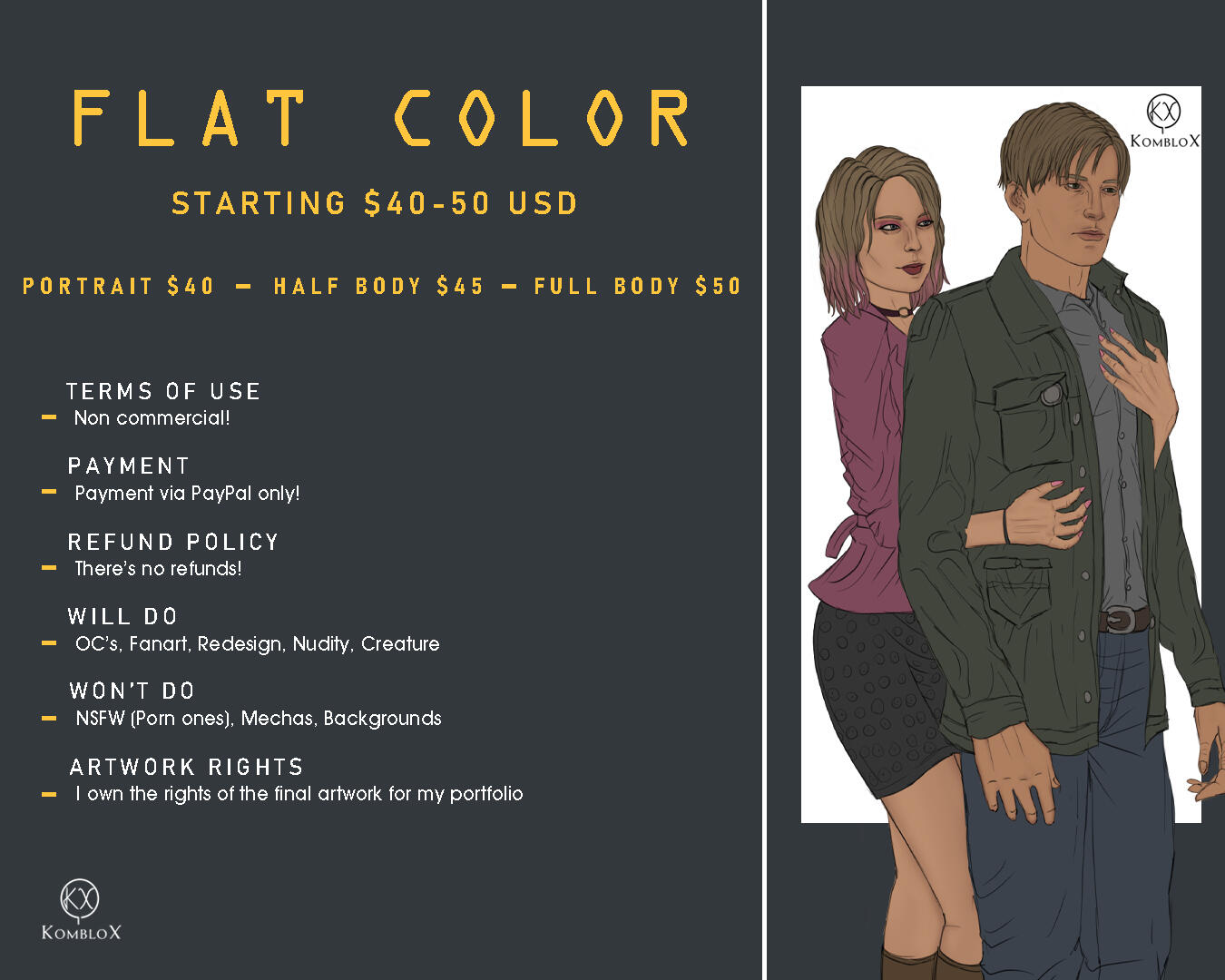 General• With every commission piece I do, I want to upload them on my socials/portfolio to promote my work as well. I own the rights of the final artwork for my portfolio and to share it online. and as well I'm allowed to reject the commission if is make me uncomfortable.• If for some reasons, anything comes up or any emergency in my family that will slow or delay the progress of the piece, I will let you know immediately, and we'll talk for alternatives.• Once the piece is finished, I'll send you the full-resolution image. If you want different sizes, please let me know for a request. Keep in mind that there is no physical product.• I won't do pieces that includes: Politics, Ai/Midjourney stuff, NSFW (Porn ones, But I'm not against nudity), Backgrounds and Mechas.• I'll do pieces like: Humans/humanoids, Animals/Creatures, Nudity, Original Characters, Redesigns, Fanart and Cyborgs (not complicated ones like Mechas or Transformers).• I don't start with the piece until the payment has been done.• The commission is for NON-COMMERCIAL use. PERSONAL use only.