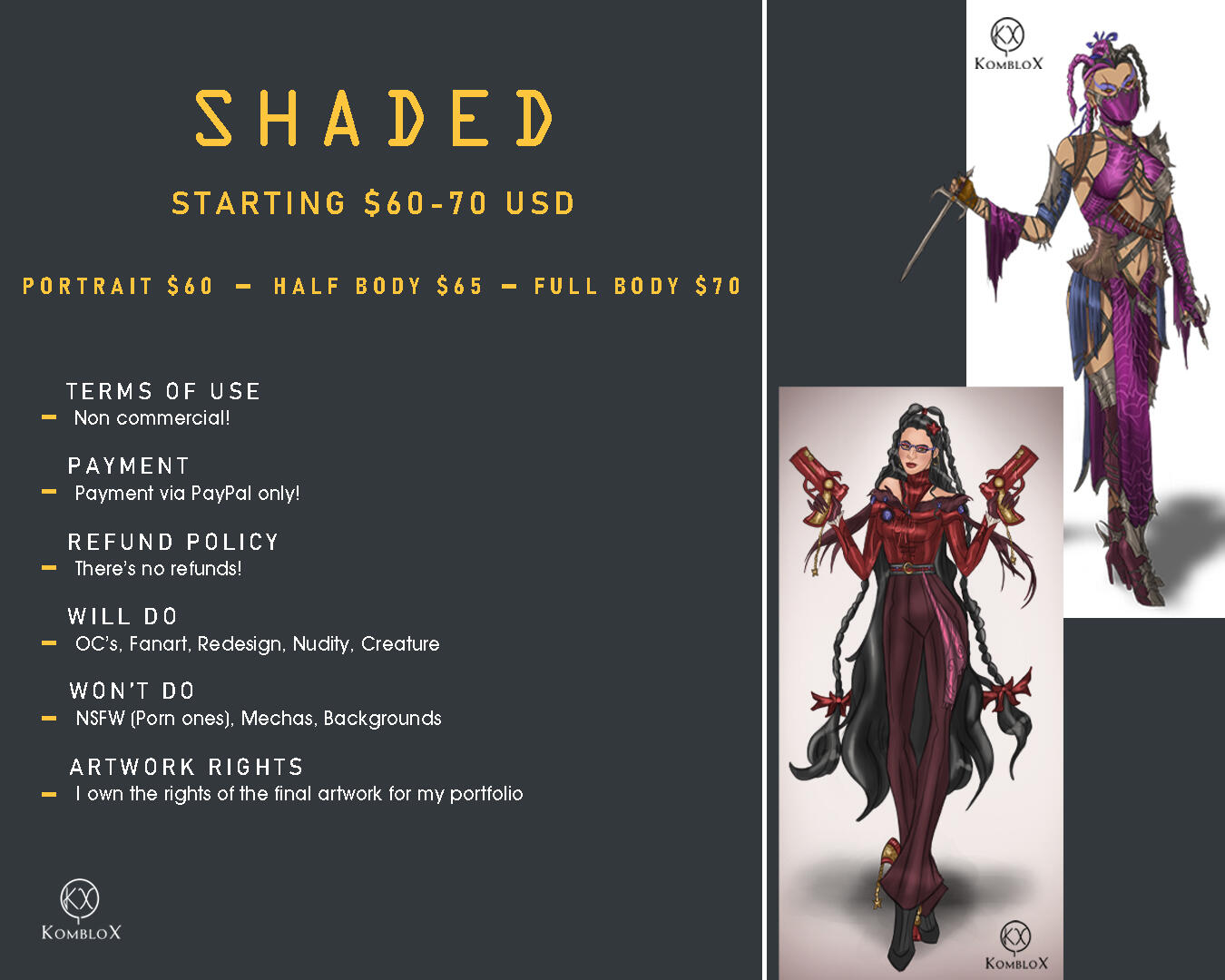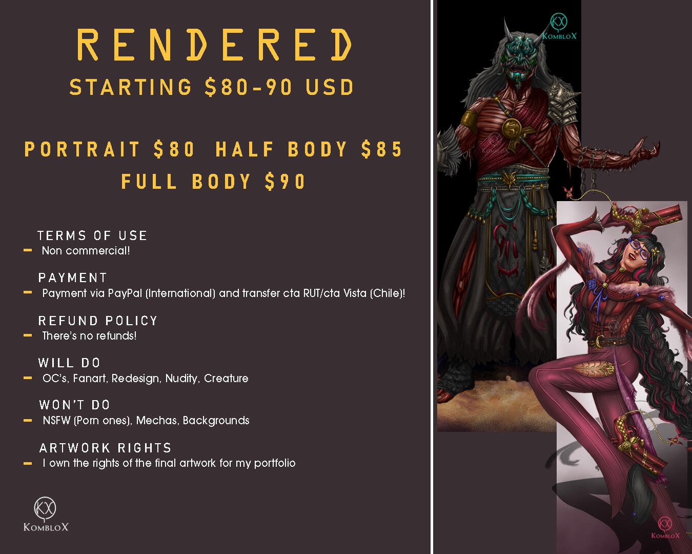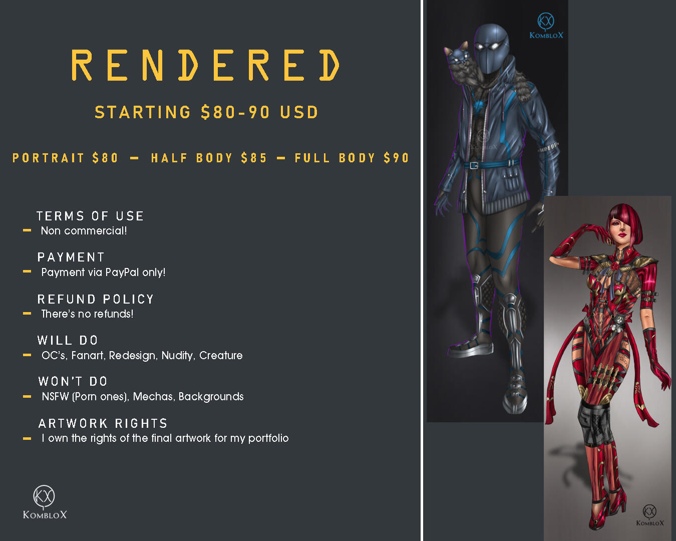 Prices:• $80 - $90 USD Starting for Character Rendered. Increases depending on complexity.